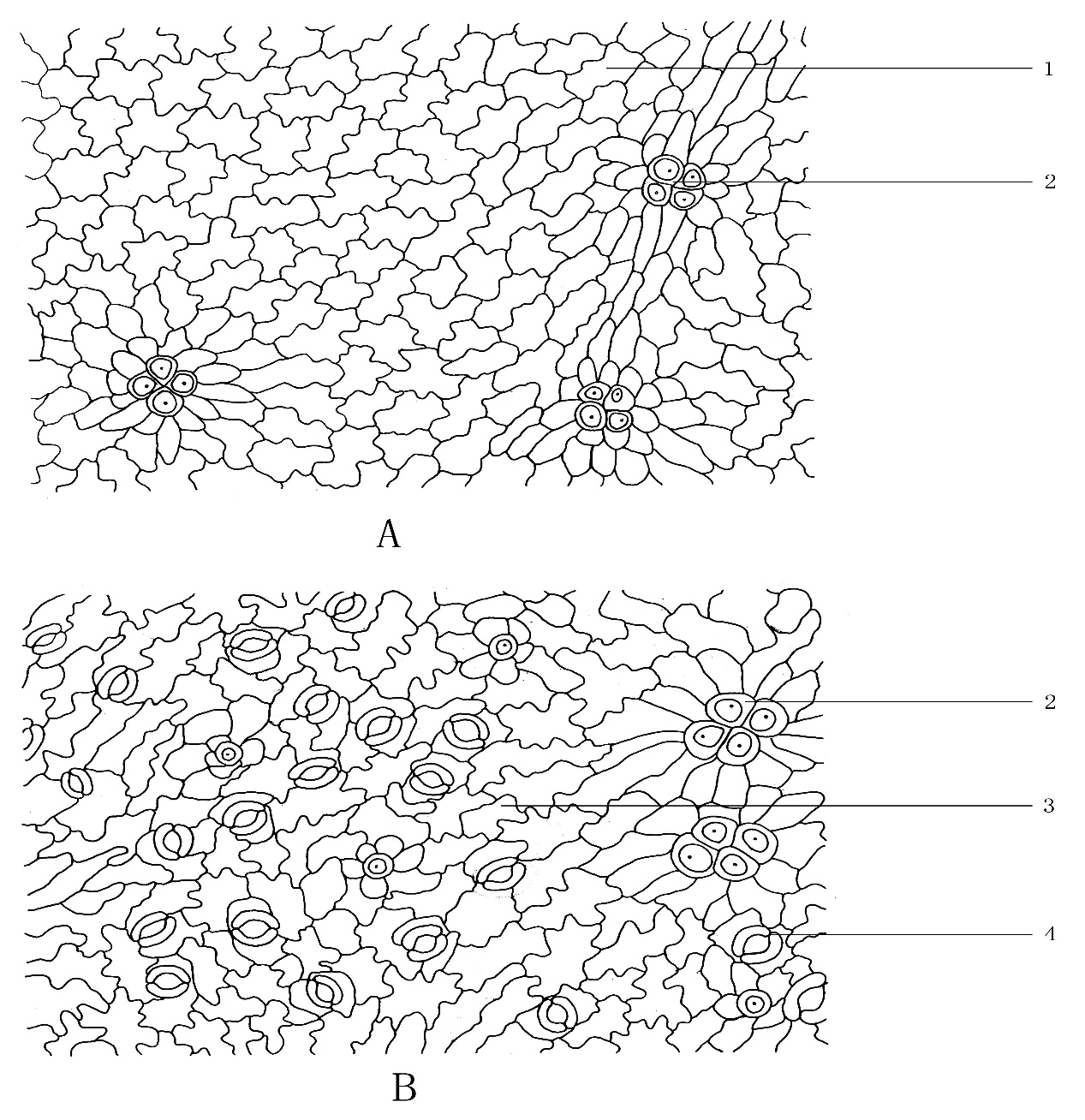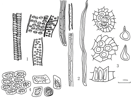 1.导管 2.木栓细胞 3.纤维 1.导管 2.纤维 3.非腺毛 4.石细胞