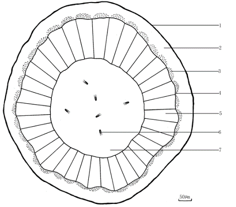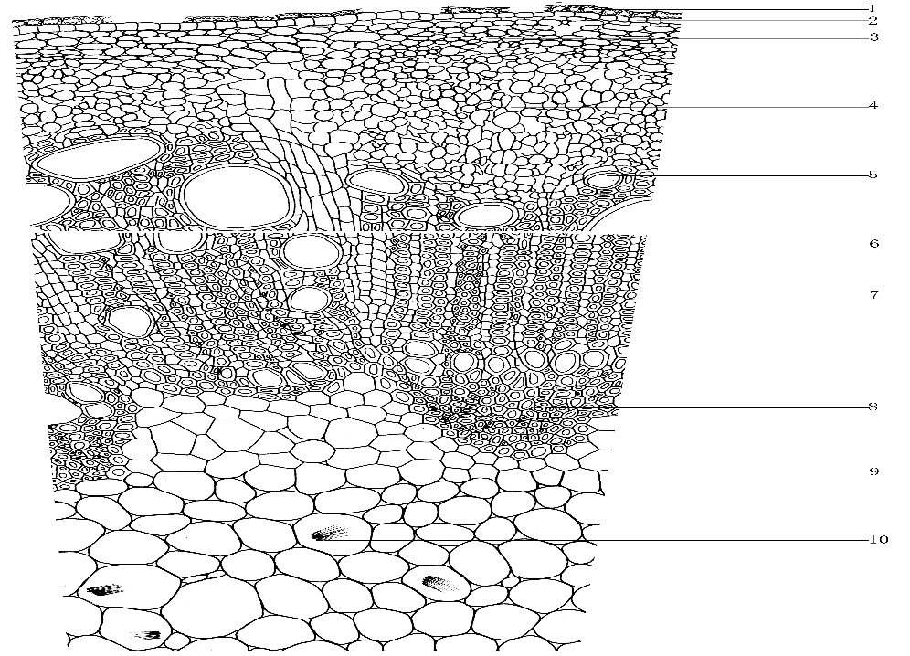 1.表皮 2.皮层 3.韧皮部 4.形成层 5.木质部 6.草酸钙针晶束 7.髓部