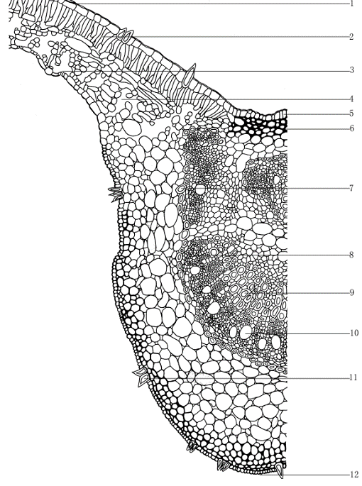 1.角质层2.栅栏组织 3.气孔 4.海绵组织 5.上表皮 6. 厚角组织7.石细胞 8.韧皮部 9.木质部 10.分泌细胞 11. 非腺毛 12.下表皮