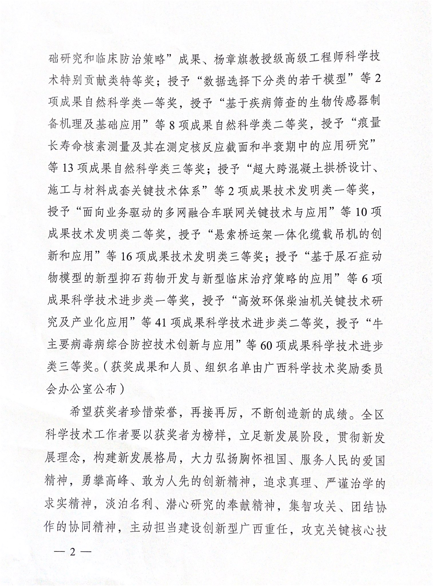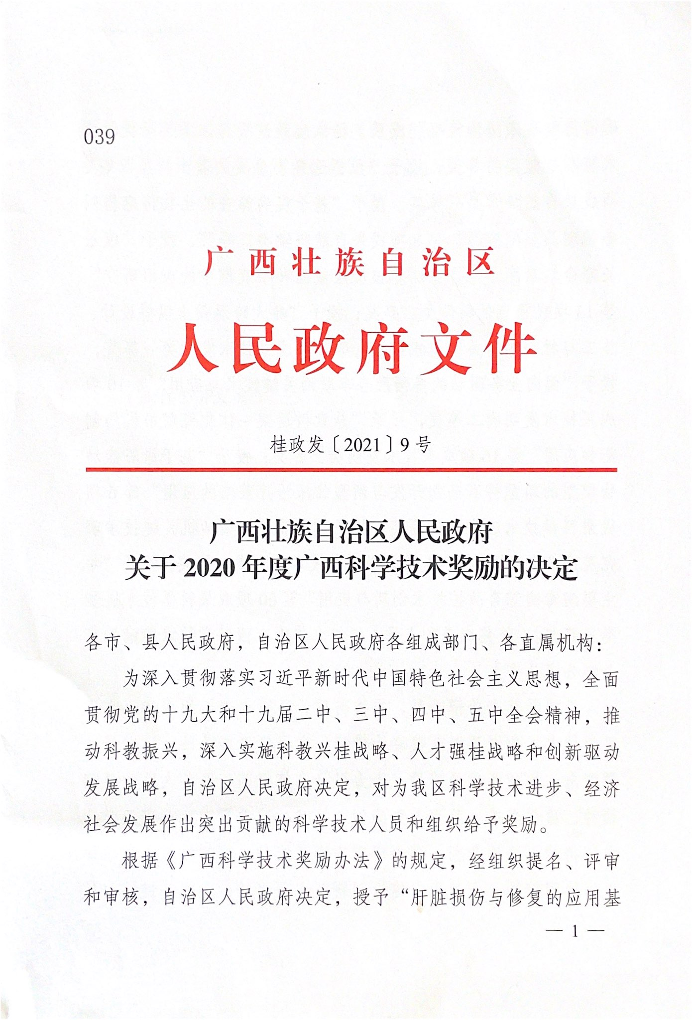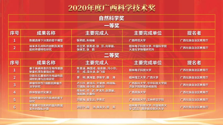 为深入贯彻落实习近平新时代中国特色社会主义思想,全面贯彻党的十九大和十九届二中、三中、四中、五中全会精神,推动振兴,深入实施科教兴桂战略、人才强桂战略和创新驱动发展战略,自治区人民政府对全区科学技术进步、经济发展做出突出贡献的科学技术人员和组织予以奖励。《广西壮族自治区人民政府关于2020年度广西科学技术奖励的决定》(桂政发〔2021〕9号)显示,共有160项科技成果获得2020年度广西科学技术奖。鸭脖作为第一完成单位有4项科技成果喜获“2020年度广西科学技术奖”,其中我平台朱华教授等主持科技成果喜获“2020年度广西科学技术奖”自然科学奖二等奖(本年度广西中医药民族医药获政府奖自然科学类最高奖项之一)。