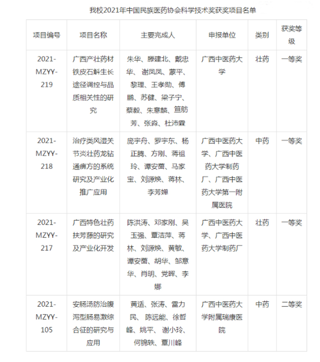 近日,中国民族医药协会发布《2021年中国民族医药协会科学技术奖公告》。据统计,鸭脖今年共有4项科研成果获奖,其中我平台主持的项目喜获2021年中国民族医药协会科学技术奖一等奖。