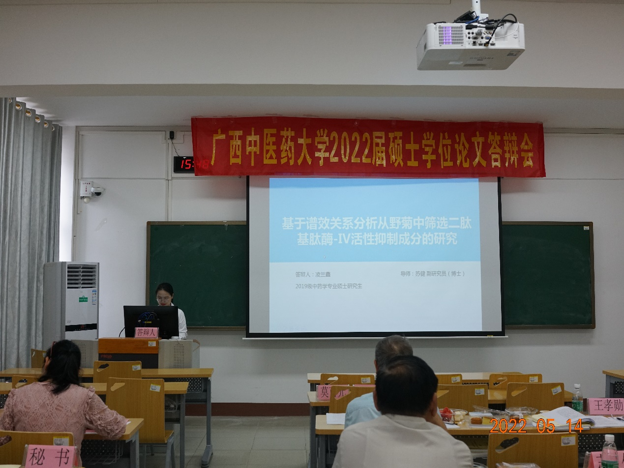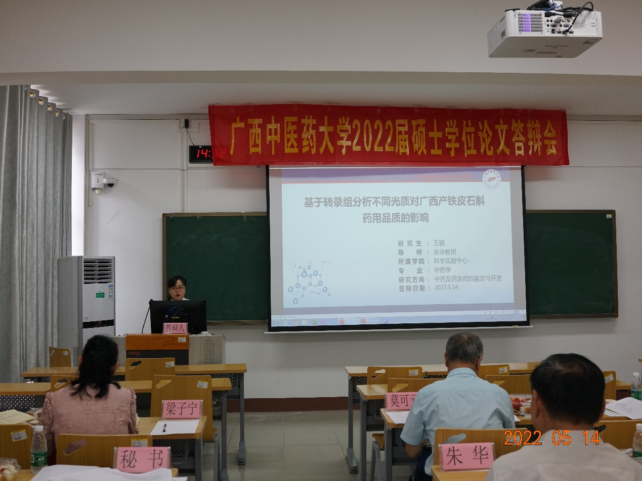 5月14日下午,平台实验室硕士研究生毕业答辩会于YABO鸭脖明秀校区时珍楼6-606教室顺利召开。本次答辩对象为2019级研究生。答辩会主席为自治区人民医院莫可元主任中药师,答辩委员会委员有YABO鸭脖梁子宁博士教授、王孝勋博士研究员、梁爽高级实验师、戴忠华博士副教授,答辩秘书张淼老师。