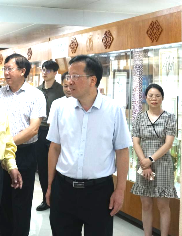 实验室负责人朱华博士教授介绍了平台建设情况,重点展示了壮瑶药理论与实践应用研究成果、科技奖项、中药资源普查标本库、壮瑶药标本数据中心以及自主研发的兰香草精油等产业化成果和团队编著出版的《壮瑶药研究》、《中药光照鉴定学》等前沿学术专著。莫锦荣书记和唐平秋书记充分肯定了我平台近年来所取得的成绩。我平台全体师生感谢领导的关怀与指导,一定要认真落实上级领导的指示精神,努力拼搏,把平台建设得更好,以实际行动推动广西中医药壮瑶医药高质量发展。广西民族大学党委常委、副校长何立荣,党委常委刘金林,鸭脖党委办公室主任周德喜、中医药壮瑶医药研究院院长王孝勋等参加调研。