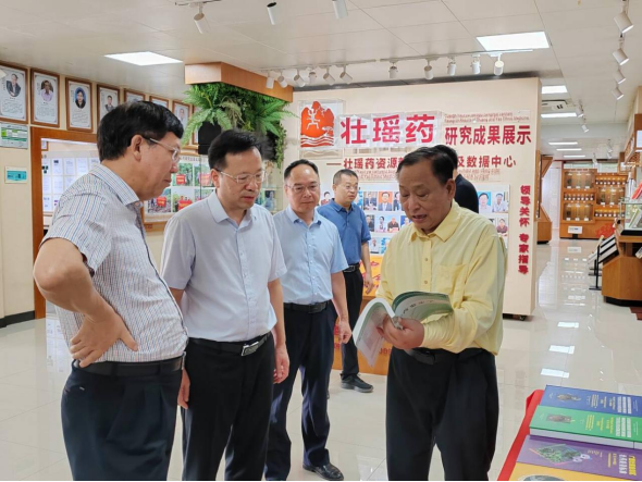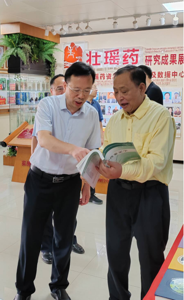 鸭脖党委书记莫锦荣和广西民族大学党委书记唐平秋莅临壮瑶药研究平台调研指导