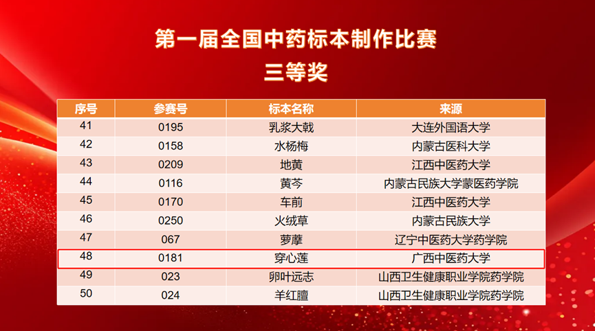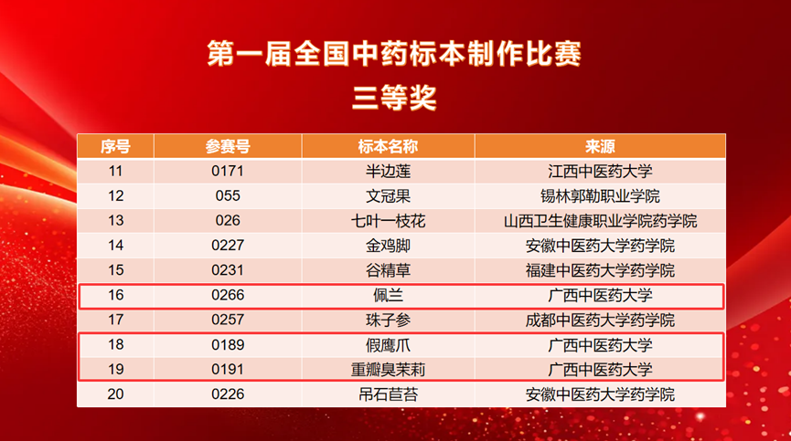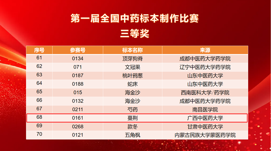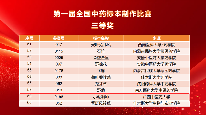 经过前期的精心准备与选拔,鸭脖壮瑶药研究平台派出3名教师带队,11名研究生参赛,共提交16件标本作品。比赛中,鸭脖壮瑶药重点实验室研究生吴文源同学(指导老师:朱华、戴忠华)制作的药用植物标本《檀香》荣获第一届全国中药标本制作比赛二等奖;研究生何丽霞、韦杰玉、陈德栋等同学制作的《假鹰爪》《重瓣臭茉莉》《穿心莲》《小粒咖啡》《蔓荆》《赪桐》《磨盘草》《佩兰》等八件药用植物标本荣获第一届全国中药标本制作比赛三等奖,充分展示了鸭脖在中药标本制作与中医药教育领域的深厚实力与学子昂扬向上的精神风貌。