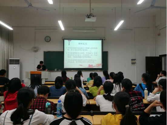 9月28日晚,仙葫校区1-111教室气氛热烈。由2017级全体班委成员分别对新生开展培训。培训内容包含课堂礼仪、尊师礼仪、公共场所礼仪、集会礼仪等方面,讲解过程中,同学们认真聆听、记录学习。活动顺利完成。