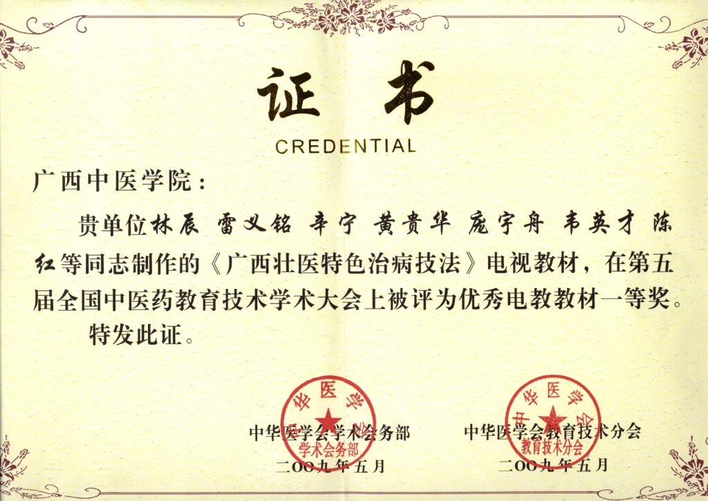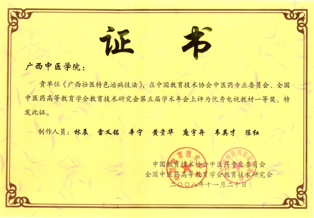 虽然壮医特色疗法教研室成立在后,但是《壮医特色疗法》、《壮医经筋学》的教材建设却从未停止过。2008年,收集整理广西民间壮医特色治病技法出版的视听教材《广西壮医特色治病技法》,获得2008年中国教育技术协会中医药专业委员会、全国中医药高等教育学会教育技术研究会第五届学术年会优秀电视教材一等奖。2008年壮医特色教材《壮医经筋疗法》获得自治区级重点教材立项,经过6年的精心酝酿,于2014年11月正式出版《中国壮医经筋学》。2012年,鸭脖《壮医药系列教材》获全国中医药行业“十二五”规划教材立项,其中《壮医外治学》、《壮医经筋学》也作为““十二五”规划教材之一,教材编写整合、更新和优化起点低、陈旧、重复、形式单调、结构体系零乱的教学内容,突出教材综合性、设计性、创新性建设。充分挖掘壮医特色疗法、壮医经筋疗法资源优势,整合壮医药最新成果,以培养实用型特色人才为目标,修订新编壮医学教材突显壮医学简、便、廉、验的特点,现教材已编写完毕,待出版发行投入使用。