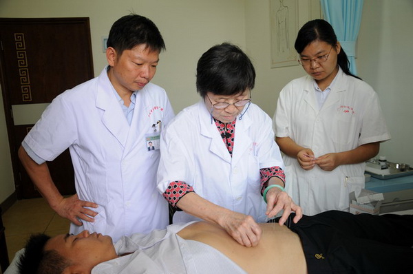 壮医药学院院长林辰教授向冯宝兰教授学习脐针疗法