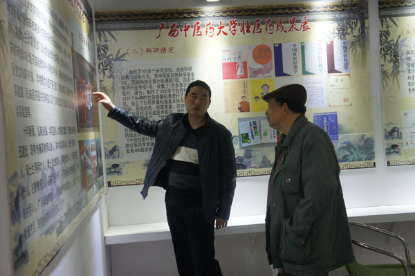 鸭脖工作人员向参观者介绍壮医药成果